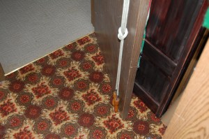 In the morning I heard Carl leave for work. I soon got up and took my shower. As I was getting dressed I heard clunk clunk. I descended the stairs and found this fitness jump rope swinging lightly in the breeze on the office door.